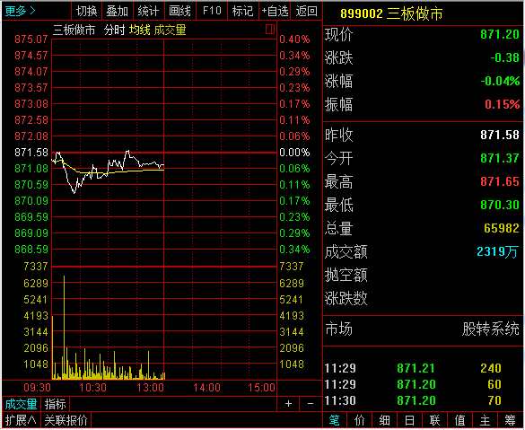 指數方面,三板做市(899002)早盤以871.37點小幅低開,開盤后小幅下跌,而后震蕩上升,截至早盤指數報收871.20點,跌幅為0.04%,成分股半天共成交2319萬元。