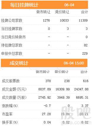 4日新增掛牌企業(yè)3家,掛牌企業(yè)總數(shù)達(dá)到11309家,做市轉(zhuǎn)讓1276家,協(xié)議轉(zhuǎn)讓10033家,待掛牌總家數(shù)82只,申報(bào)中總家數(shù)達(dá)到229家。