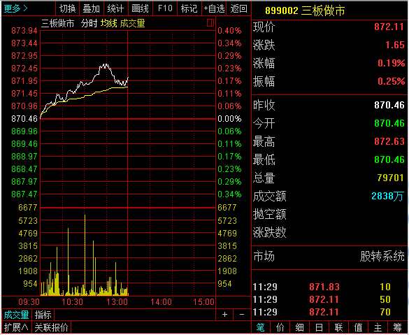 指數(shù)方面,三板做市(899002)今日早盤以870.46點(diǎn)平開,開盤后指數(shù)震蕩上升,而后小幅下跌,截至早盤指數(shù)報(bào)收872.11點(diǎn),漲幅為0.19%,成分股半天共成交2838萬元。