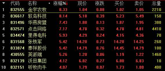 做市漲幅方面,創(chuàng)新層企業(yè)金宇農(nóng)牧(832555)漲8.33%領(lǐng)漲做市股;基礎(chǔ)層方面,康普常青(430698)漲15.75%居于基礎(chǔ)層漲幅榜首。