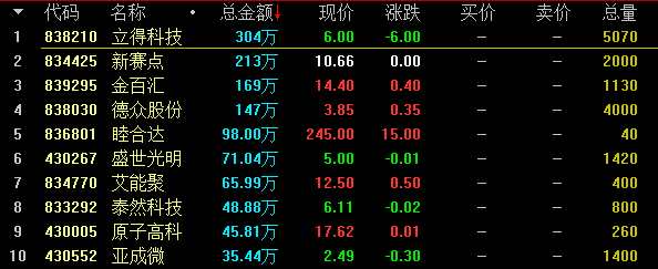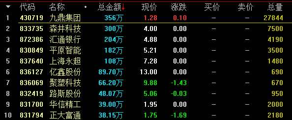從成交額情況來看,基礎(chǔ)層企業(yè)九鼎集團(430719)成交356萬元位于競價交易榜首;創(chuàng)新層方面,立得科技(838210)成交304萬元居創(chuàng)新競價成交額榜首。