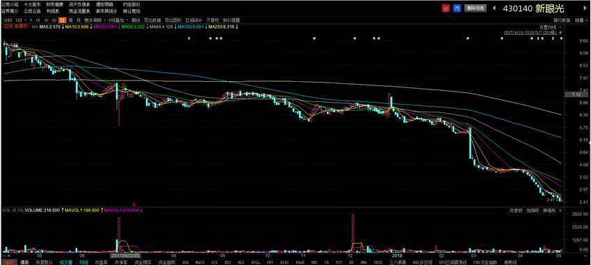 二級市場方面,新眼光股價自2017年4月以來持續(xù)走低。今年5月7日,其股價盤中觸底,跌至2.41元/股。