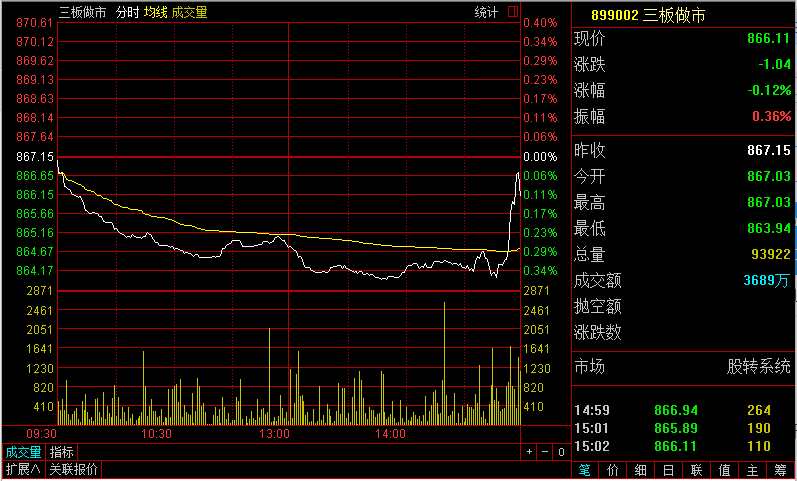 指數(shù)方面,三板做市(899002)今日以867.03點(diǎn)低開(kāi),開(kāi)盤后,一路震蕩下行,最低報(bào)863.94點(diǎn),臨近收盤快速拉升,跌幅收窄,最終報(bào)收866.11點(diǎn),跌幅為0.12%,成分股全天成交3689萬(wàn)元。