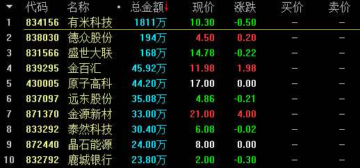 創(chuàng)新層競(jìng)價(jià)交易股票盤內(nèi)成交額前十名
