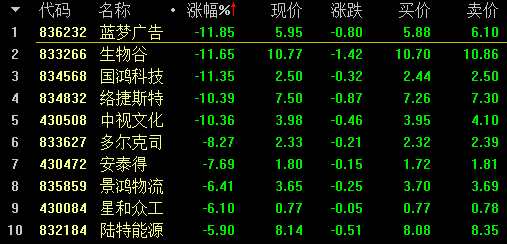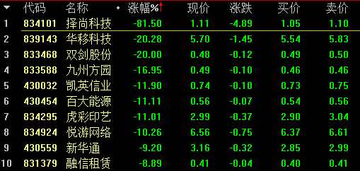 做市股跌幅榜方面,創(chuàng)新層中,藍(lán)夢(mèng)廣告(836232)跌11.85%居首;基礎(chǔ)層企業(yè)擇尚科技(834101)跌81.5%領(lǐng)跌做市股。