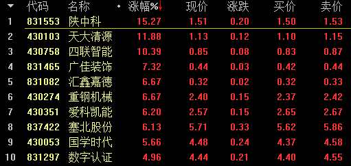 做市漲幅方面,創(chuàng)新層方面,派拉軟件(831194)漲12.12%領(lǐng)漲做市股;基礎(chǔ)層企業(yè)中陜中科(831553)漲15.27%居于基礎(chǔ)層漲幅首位。