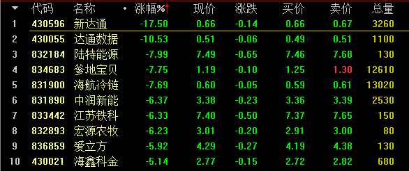 做市股跌幅榜方面,創(chuàng)新層企業(yè)新達通(430596)跌17.50%領(lǐng)跌做市股;基礎(chǔ)層方面,天藍環(huán)保(833772)跌21.59%居基礎(chǔ)層跌幅榜首。