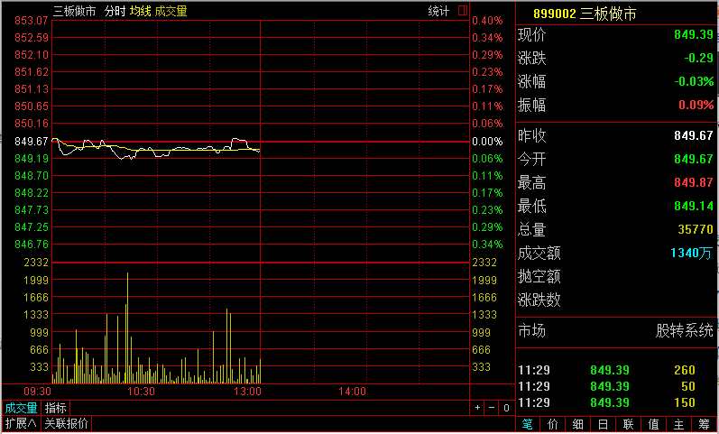 指數(shù)方面,三板做市(899002)今日以849.67點平開,開盤后持續(xù)橫盤震蕩,截至11:30,做市指數(shù)報849.39點,微跌0.03%,成分股上午成交1340萬元。