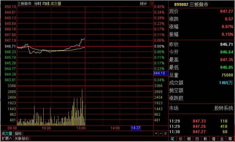 指數(shù)方面,三板做市(899002)今日以846.64點低開,開盤后短暫上揚后小幅下跌,最低報846.05點。隨后震蕩上行,截至11:30,做市指數(shù)報847.27點,漲0.07%,結(jié)束九連陰,成分股上午成交1465萬元。