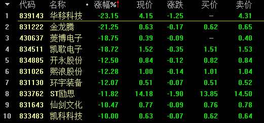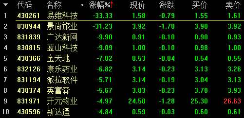 做市股跌幅榜方面,創(chuàng)新層中,易維科技(430261)跌33.33%居首;基礎層企業(yè)華移科技(839143)跌%領跌做市股。