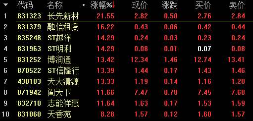 做市漲幅方面,創(chuàng)新層方面,藍海駱駝(832444)漲11.9%領漲做市股;基礎層企業(yè)中長先新材(831323)漲21.55%居于基礎層漲幅首位。