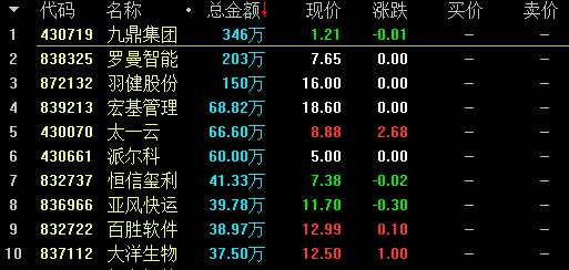 從成交額情況來看,創(chuàng)新層企業(yè)有米科技(834156)成交1823萬元居首,基礎層企業(yè)九鼎集團(430719)成交346萬元次之。