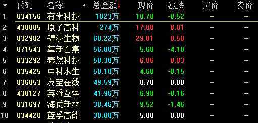 創(chuàng)新層競價交易股票盤內(nèi)成交額前十名