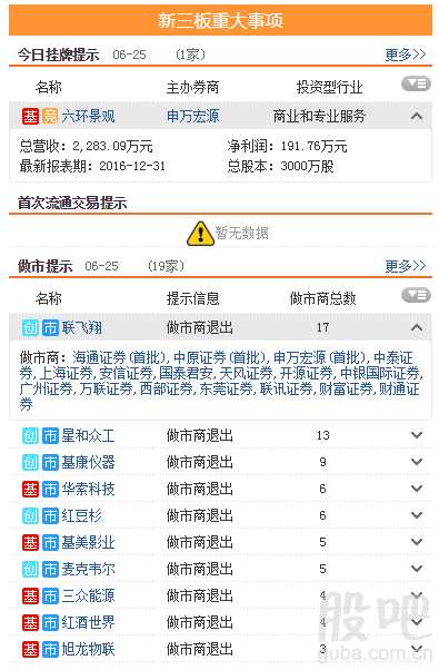 昨日新增掛牌企業(yè)2家,掛牌企業(yè)總數(shù)達(dá)到11261家,截至2018年6月25日,掛牌企業(yè)總數(shù)達(dá)到11261家。