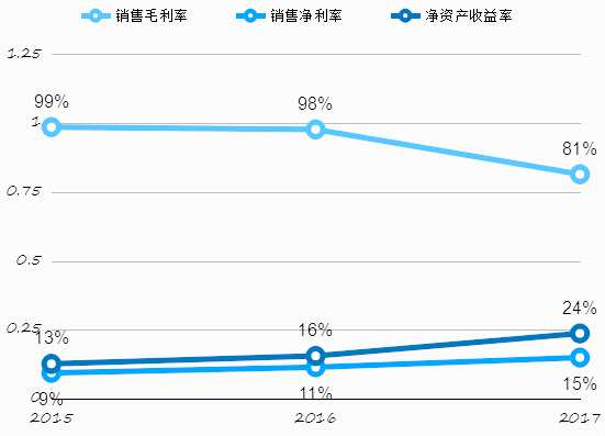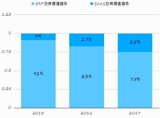 近兩年公司的盈利增長明顯超過營收,說明公司前期的SaaS業(yè)務布局和投入開始在盈利端發(fā)力。2017年的SaaS業(yè)務營收占比已達到24.69%,營收增長94.68%,而ERP業(yè)務的營收增速只有30.51%。2015年-2017年,雖然產(chǎn)品毛利率從98.54%下降到了81.43%,但是銷售凈利潤從9.33%上升到14.91%,凈資產(chǎn)收益率從12.64%上升到23.67%,盈利能力提升明顯。