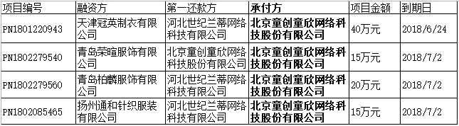 根據(jù)公告,目前道口貸的逾期金額已經(jīng)達(dá)到90萬(wàn)元。其中,天津冠英、青島榮喧等4家企業(yè)作為融資方,而童創(chuàng)童欣為應(yīng)收款融資項(xiàng)目的承付方。
