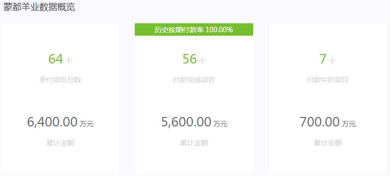 值得注意的是,蒙都羊業(yè)在該平臺(tái)的歷史承付項(xiàng)目為64個(gè),累計(jì)金額為6400萬(wàn)元。其中,56個(gè)為付款完成項(xiàng)目,7個(gè)為付款中的項(xiàng)目。