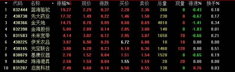 做市漲幅方面,藍海駱駝(832444)漲19.27%領(lǐng)漲創(chuàng)新層做市股;基礎(chǔ)層方面,凱科科技(833483)漲26.09%居于漲幅榜首。