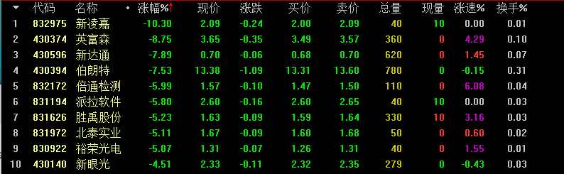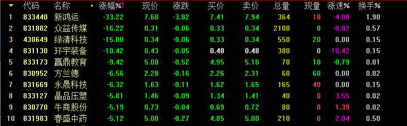 做市股跌幅榜方面,創(chuàng)新層企業(yè)新凌嘉(832975)跌10.30%領(lǐng)跌做市股;基礎(chǔ)層方面,新鴻運跌33.22%居基礎(chǔ)層跌幅榜首。