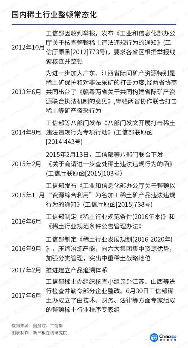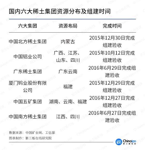 為了改變國內(nèi)稀土廠商無序競爭導(dǎo)致戰(zhàn)略資源重大浪費(fèi)的問題。2011年5月,國務(wù)院發(fā)布《國務(wù)院關(guān)于促進(jìn)稀土行業(yè)持續(xù)健康發(fā)展的若干意見》。經(jīng)過六年多的專項整治,行業(yè)內(nèi)已基本完成具有資源開采、冶煉分離加工應(yīng)用與技術(shù)研發(fā)于一體的六大稀土集團(tuán)的組建。