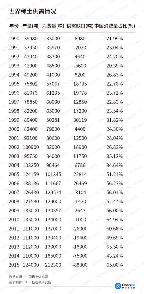 根據(jù)世界稀土供需趨勢,1990年至2006年,世界稀土一直處于供大于求的狀態(tài),期間中國消費(fèi)量約占世界稀土消費(fèi)的25%左右,從供需缺口來看,每年基本都有盈余。