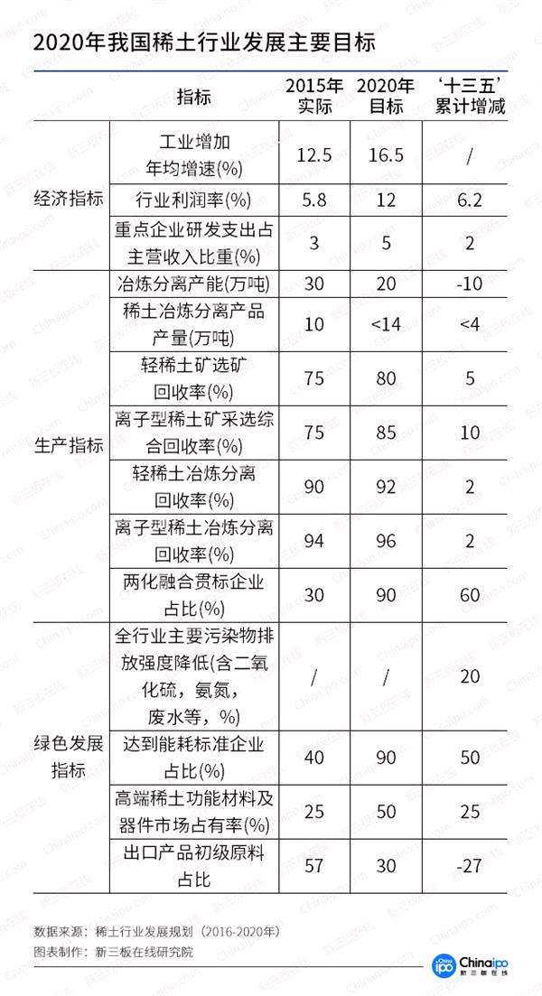 根據(jù)規(guī)劃目標(biāo),2020年稀土行業(yè)工業(yè)增加年均增速要從12.5%升至16.5%;行業(yè)利潤率從5.8%升至12%;輕稀土礦選礦回收率從75%升至80%;高端稀土功能材料及器件市場占有率從25%升至50%。