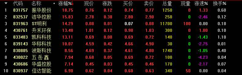 做市漲幅方面,捷尚股份(832325)漲11.02%領(lǐng)漲創(chuàng)新層做市股;基礎(chǔ)層方面,振華股份(603067,股吧)(831757)漲18.75%居于漲幅榜首。