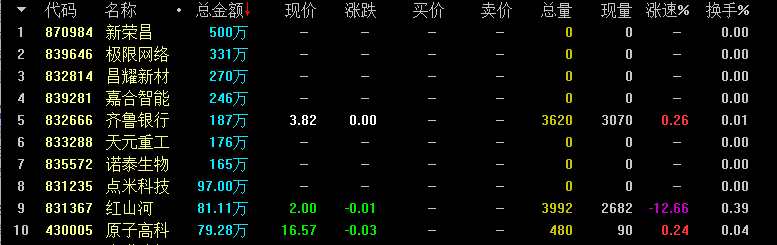創(chuàng)新層競價交易股票盤內(nèi)成交額前十名