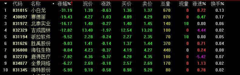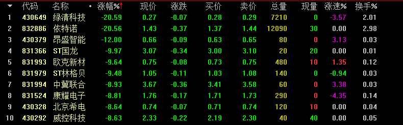 做市股跌幅榜方面,創(chuàng)新層企業(yè)小白龍(831015)跌31.19%領(lǐng)跌做市股;基礎(chǔ)層方面,綠清科技(430649)跌20.59%居基礎(chǔ)層跌幅榜首。