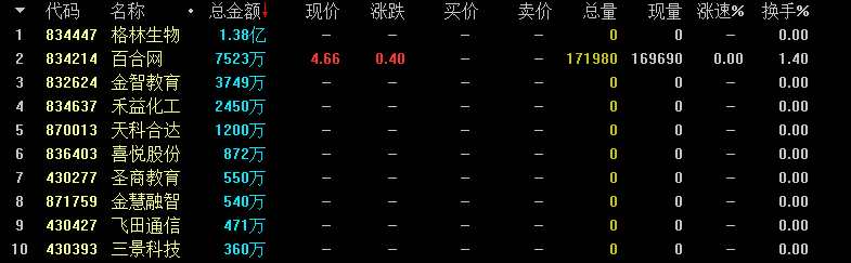 從成交額情況來看,基礎(chǔ)層企業(yè)格林生物(834447)成交1.38億元居首,基礎(chǔ)層企業(yè)百合網(wǎng)成交7523萬元次之。