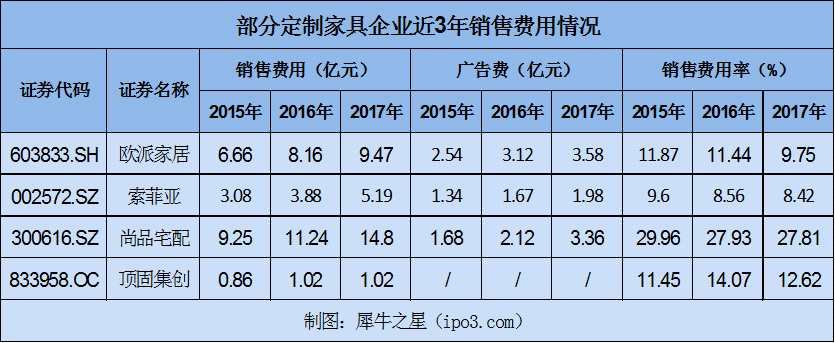 砸起廣告來也毫不含糊。這從其銷售費用及銷售費用率可見一斑。2015年至2017年,歐派家居、索菲亞、尚品宅配銷售費用率在8%-12%,而選擇直營方式的尚品宅配則更是達到驚人的27%以上。