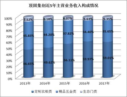 頂固集創(chuàng)成立于2002年,成立之初公司主要從事精品五金業(yè)務;2005年,基于原有的五金技術(shù),新增了定制滑動門配件業(yè)務;2007 年起,增加定制衣柜和定制生態(tài)門等業(yè)務;2013 年公司戰(zhàn)略調(diào)整,在保留精品五金、定制生態(tài)門業(yè)務的基礎上,停止銷售滑動門及衣柜的配件業(yè)務,改為銷售定制滑動門及整體定制家具業(yè)務(即從配件銷售變?yōu)槌善蜂N售);2015 年開始向全屋定制方向拓展。