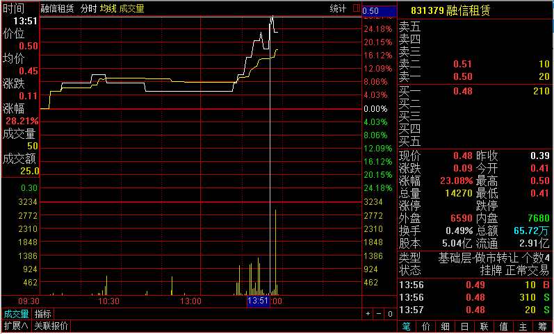 7月11日,融信租賃(831379)午盤急速拉升,截至13:51,最高漲幅達28.21%,報價0.50元/股。