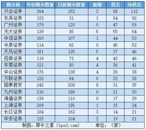 據(jù)統(tǒng)計,年初至今共有17家做市商凈退出超20家。興業(yè)證券居首,其次為東吳證券和廣州證券,分別凈退出92家和59家。