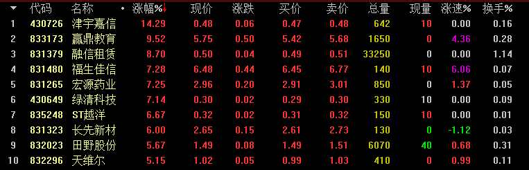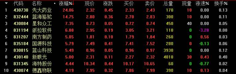 做市漲幅方面,先大藥業(yè)漲24.06%領(lǐng)漲創(chuàng)新層做市股;基礎(chǔ)層方面,津宇嘉信(430726)漲14.29%居于漲幅榜首。