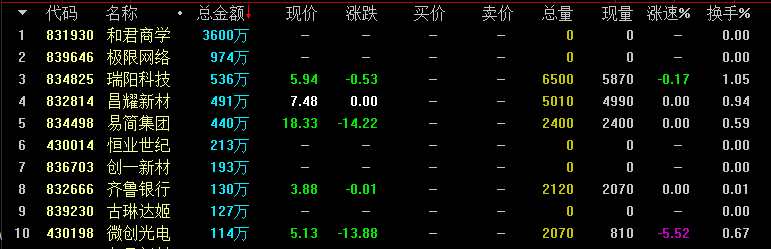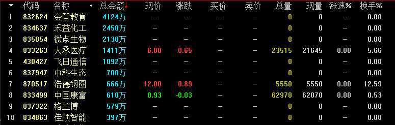 從成交額情況來看,基礎(chǔ)層企業(yè)金智教育(832624)成交4124萬元居首,創(chuàng)新層企業(yè)和君商學(xué)(831930)成交3600萬元次之。
