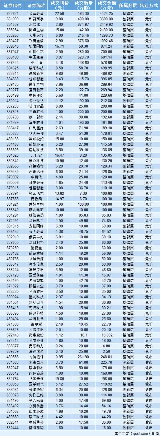 累計(jì)成交金額前五名的新三板企業(yè)分別為:金智教育(832624)成交4124.25萬(wàn)元、和君商學(xué)(831930)成交3600萬(wàn)元、禾益化工(834637)成交2449.92萬(wàn)元、微點(diǎn)生物(835054)成交2130萬(wàn)元、大承醫(yī)療(833263)成交1298.73萬(wàn)元。