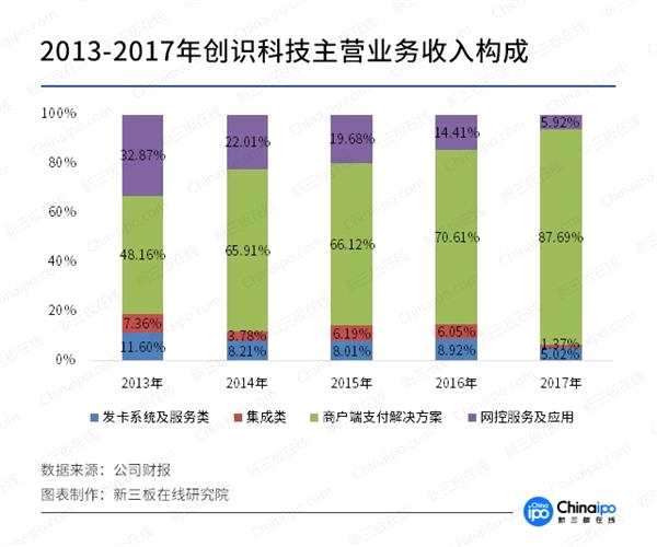 創(chuàng)識(shí)科技能夠提供從發(fā)卡到收單整個(gè)電子支付業(yè)務(wù)鏈條的一體化解決方案,并成功開發(fā)了國(guó)內(nèi)第一個(gè)覆蓋全國(guó)400多個(gè)城市的信用卡網(wǎng)絡(luò)系統(tǒng)。以電子支付IT系統(tǒng)增值服務(wù)為主營(yíng)業(yè)務(wù)的創(chuàng)識(shí)科技也在不斷提升商戶端支付解決方案在公司收入中的占比。