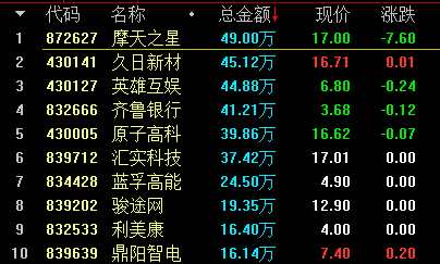 創(chuàng)新層競(jìng)價(jià)交易股票盤內(nèi)成交額前十名