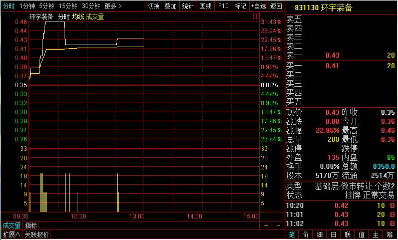 7月24日,環(huán)宇裝備(831130)早盤以0.36元/股高開,開盤后持續(xù)上漲,最高0.46元/股,截止午后收盤,報價0.43元/股,上漲22.86%。