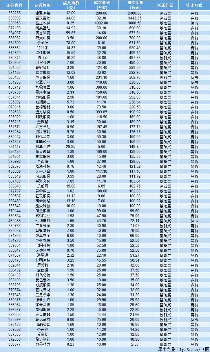 累計成交金額前五名的新三板企業(yè)分別為:建通測繪(832255)成交2400萬元、壹玖壹玖(830993)成交1443.35 萬元、鑫莊農(nóng)貸(830958)成交1000.5萬元、網(wǎng)娛互動(872139)成交896.69 萬元、清睿教育(834987)成交873.81 萬元。