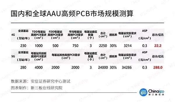 隨著5G全面商用的腳步越來越近,對于PCB/覆銅板行業(yè)來說無疑是一個新的風口。根據(jù)安信證券研究中心的預測,5G僅僅在射頻側,PCB的市場規(guī)模可以達到288億一年,5G時代高頻PCB板及覆銅板的市場規(guī)模都將是4G的10倍以上。