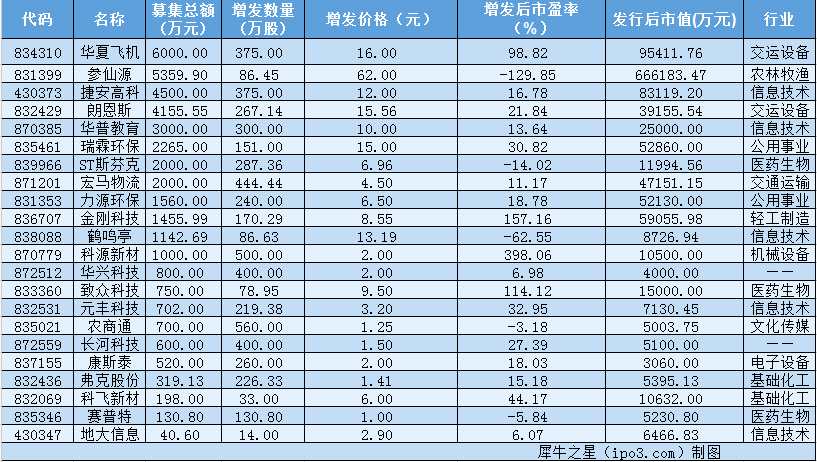 本周共有22家掛牌公司完成定增融資,累計(jì)融資額3.92億元。其中,融資超過2000萬(wàn)元的公司有8家。華夏飛機(jī)(834310)以成功融資6000萬(wàn)元居本周融資額榜首。