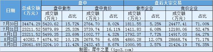本周(7月30日—8月3日)新三板市場(chǎng)交易總額為14.93億元,其中盤內(nèi)成交3.67億元,盤后大宗交易成交11.26億元。