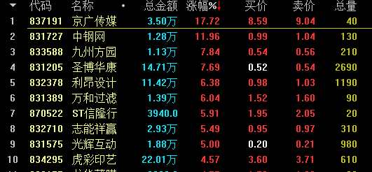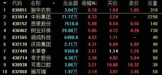 做市漲幅方面,駿華農(nóng)牧(830851)漲8.7%領(lǐng)漲創(chuàng)新層做市股;基礎(chǔ)層方面,京廣傳媒(837191)漲17.72%,居于漲幅榜首。