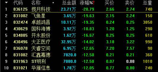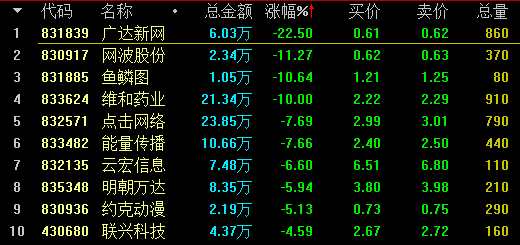 做市股跌幅方面,創(chuàng)新層企業(yè)廣達新網(wǎng)(831839)跌22.50%領(lǐng)跌創(chuàng)新做市股;基礎(chǔ)層方面,攬月科技(836125)跌28.79%居基礎(chǔ)層跌幅榜首。