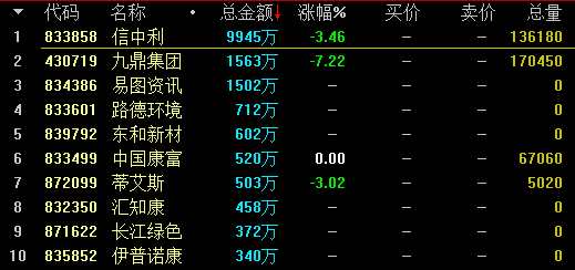從成交額情況來看,基礎(chǔ)層信中利(833858)成交9945萬居首,創(chuàng)新層和君商學(831930)成交3440萬次之。