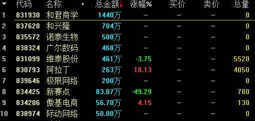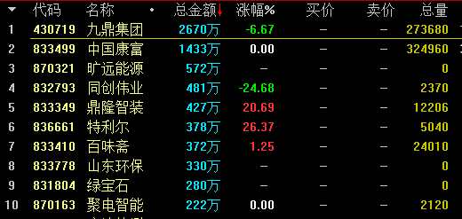 從成交額情況來(lái)看,基礎(chǔ)層九鼎集團(tuán)(430719)成交2670萬(wàn)居首,創(chuàng)新層和君商學(xué)(831930)成交1440萬(wàn)次之。