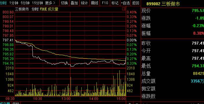 指數(shù)方面,三板做市(899002)今日以797.41點(diǎn)平開,開盤后便一直震蕩下行,尾盤有所拉升,但未翻紅。截至收盤報(bào)收795.57點(diǎn),成分股全天成交3356萬(wàn)。