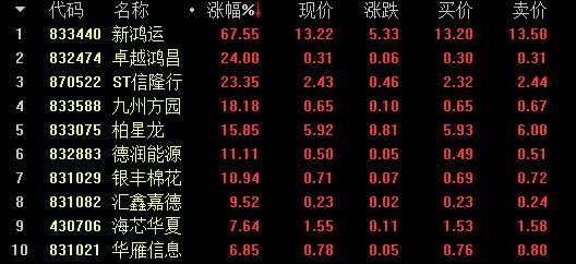 做市漲幅方面,駿華農(nóng)牧(830851)漲13%領(lǐng)漲創(chuàng)新層做市股;基礎(chǔ)層方面,新鴻運(yùn)(833440)漲67.55%,居于漲幅榜首。